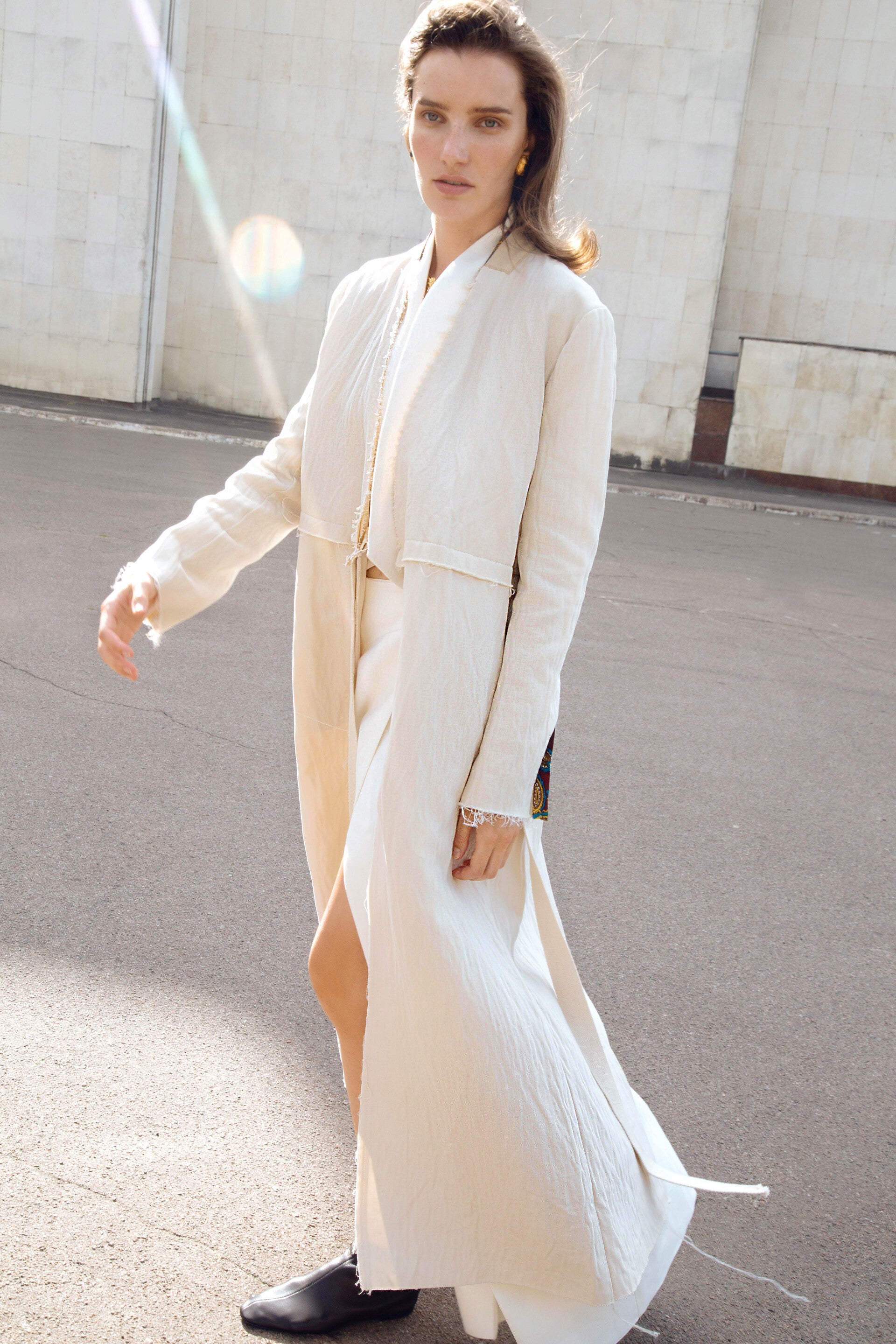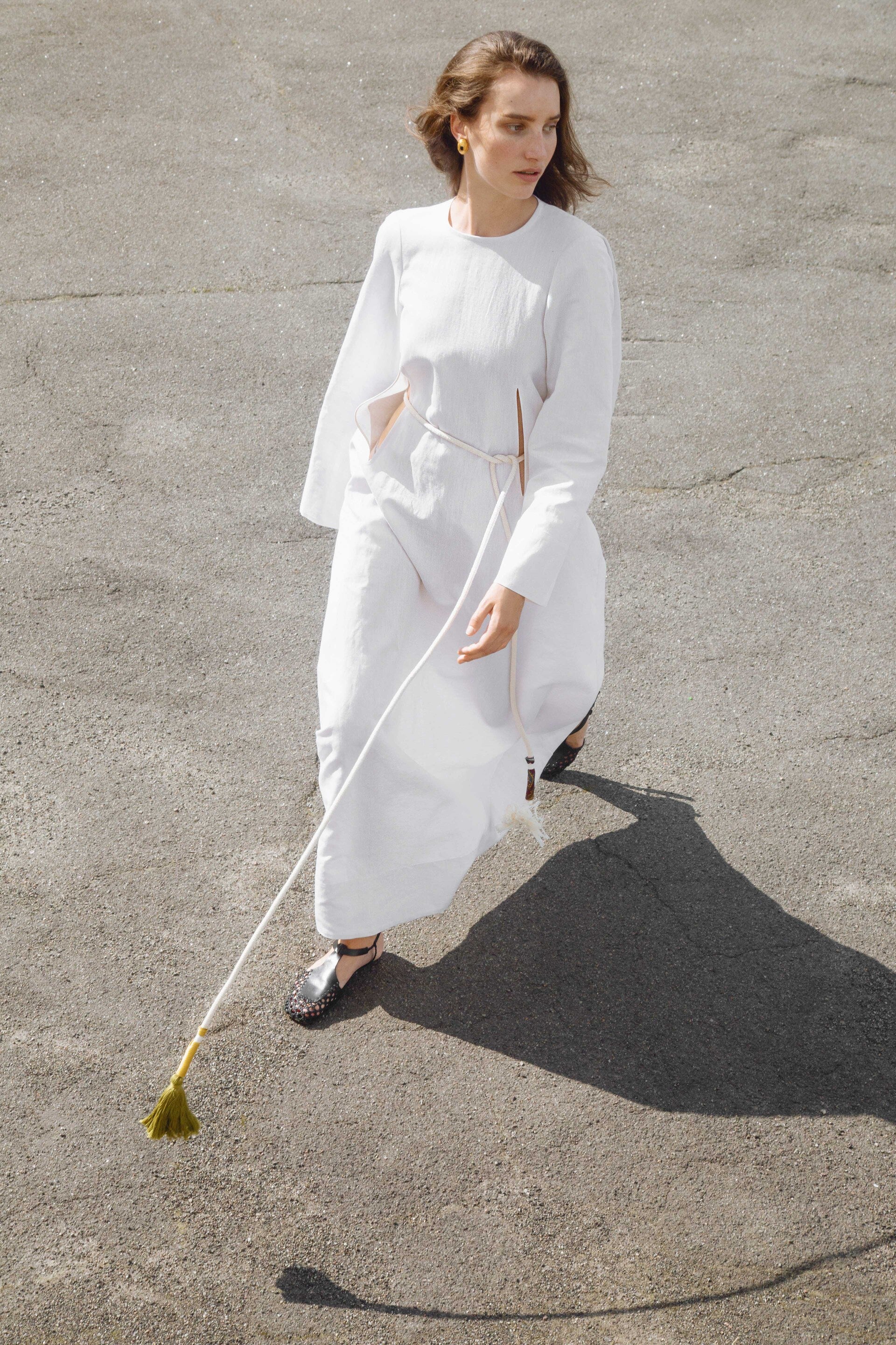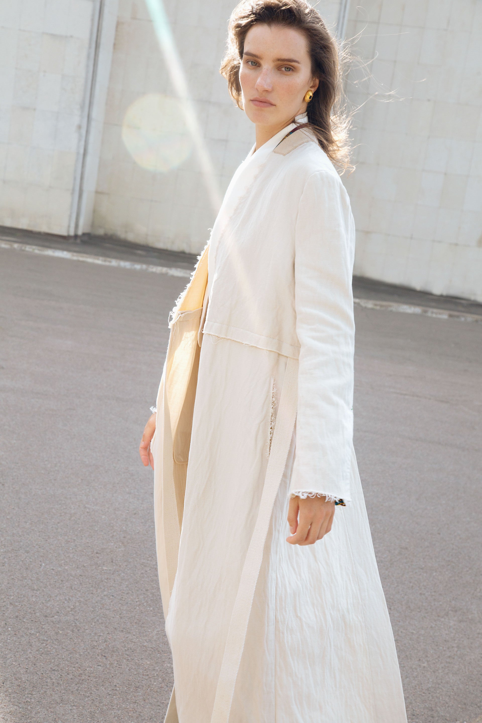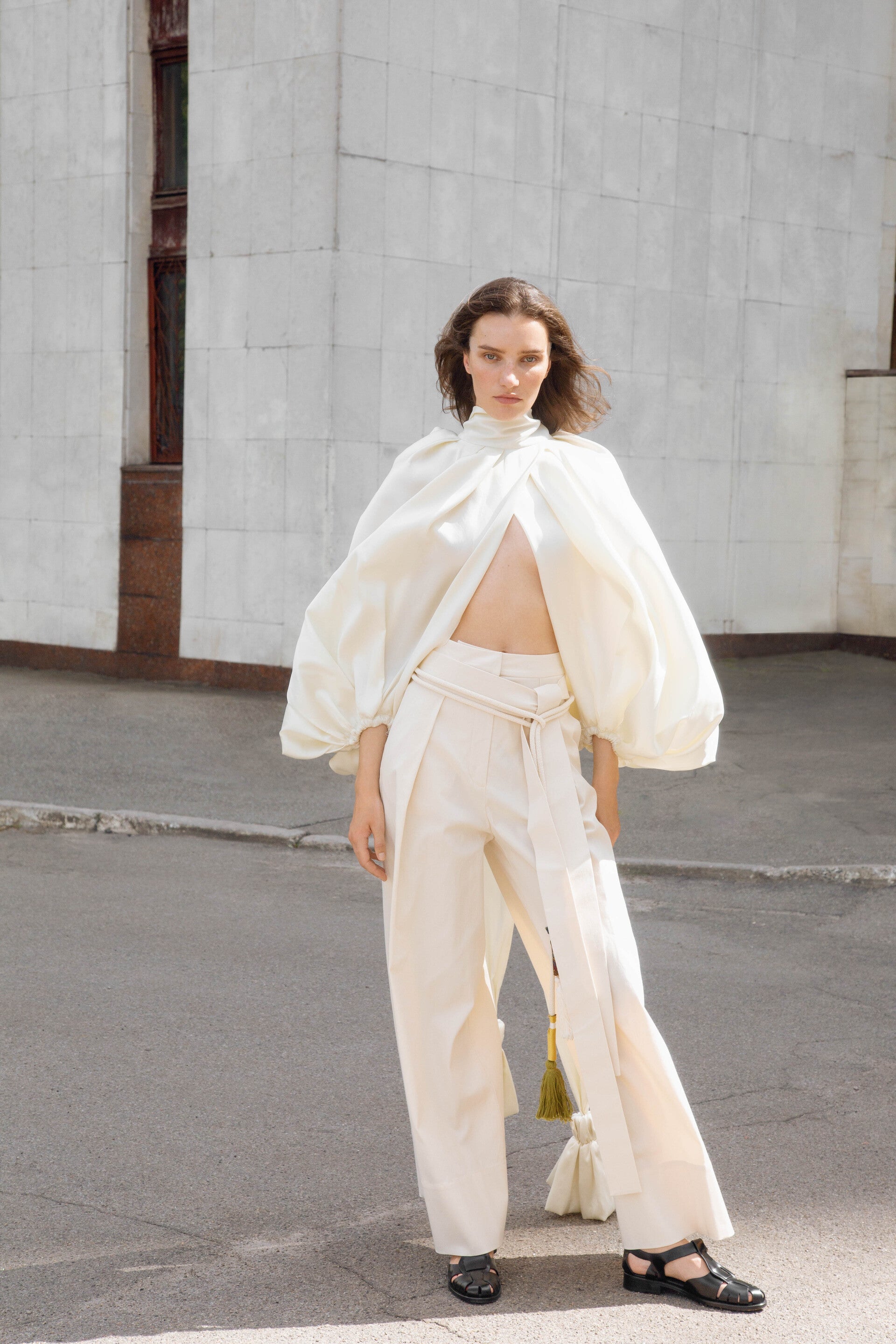 The collection showcases a rich selection of fabrics, featuring linen, cotton, silk, and taffeta. Some items undergo a labor-intensive, unique handwashing technique, resulting in a «crush» effect that exudes relaxed elegance. A carefully curated color palette weaves together shades of white, cream, ecru, and gray, complemented by subtle bursts of green, pink, andred.