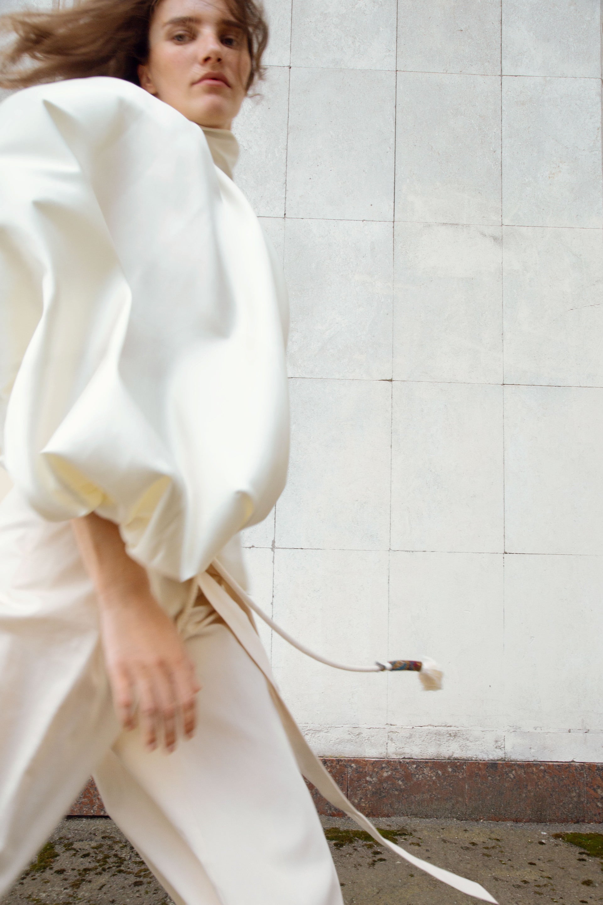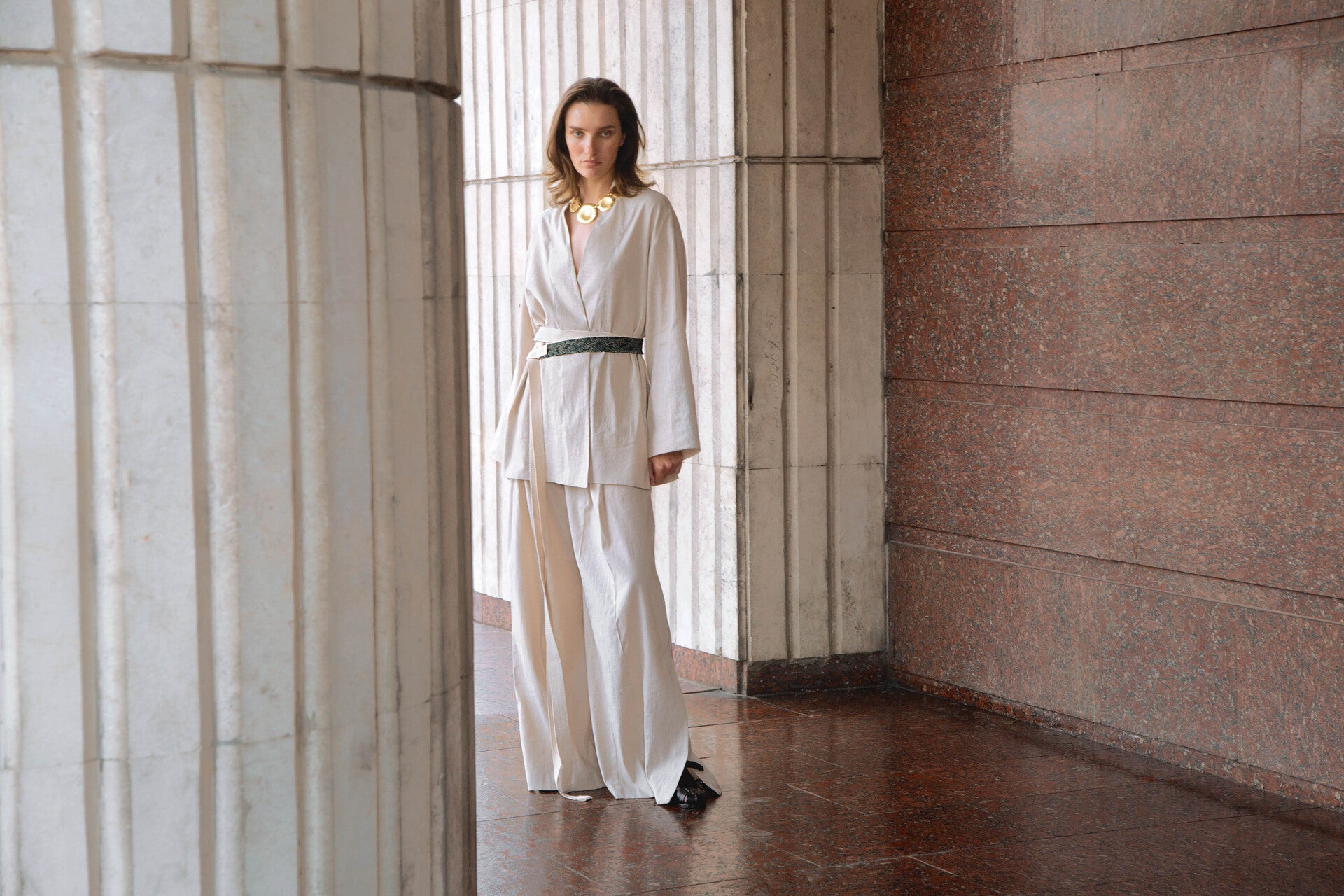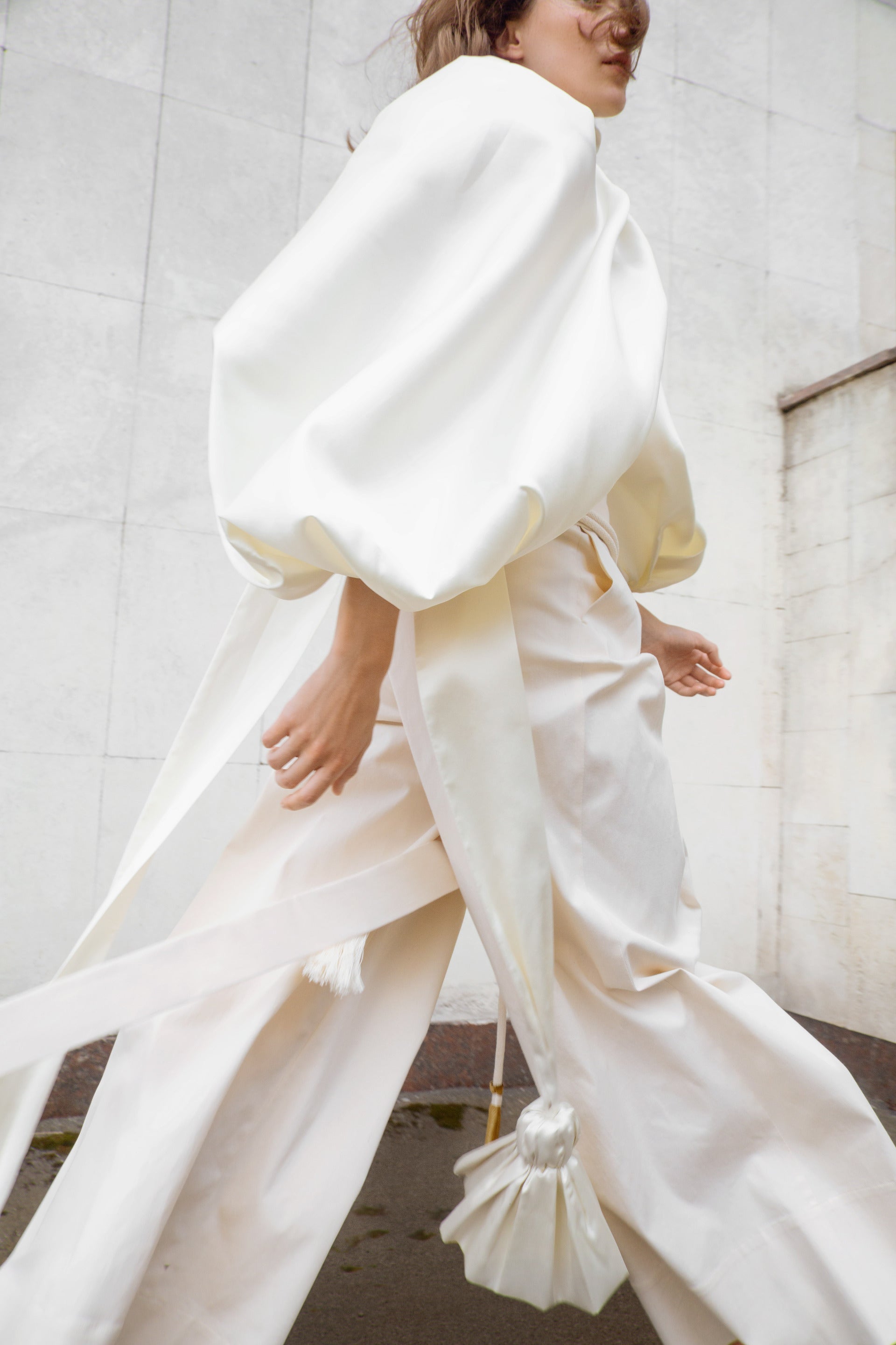 The collection showcases a rich selection of fabrics, featuring linen, cotton, silk, and taffeta. Some items undergo a labor-intensive, unique handwashing technique, resulting in a «crush» effect that exudes relaxed elegance. A carefully curated color palette weaves together shades of white, cream, ecru, and gray, complemented by subtle bursts of green, pink, andred.
