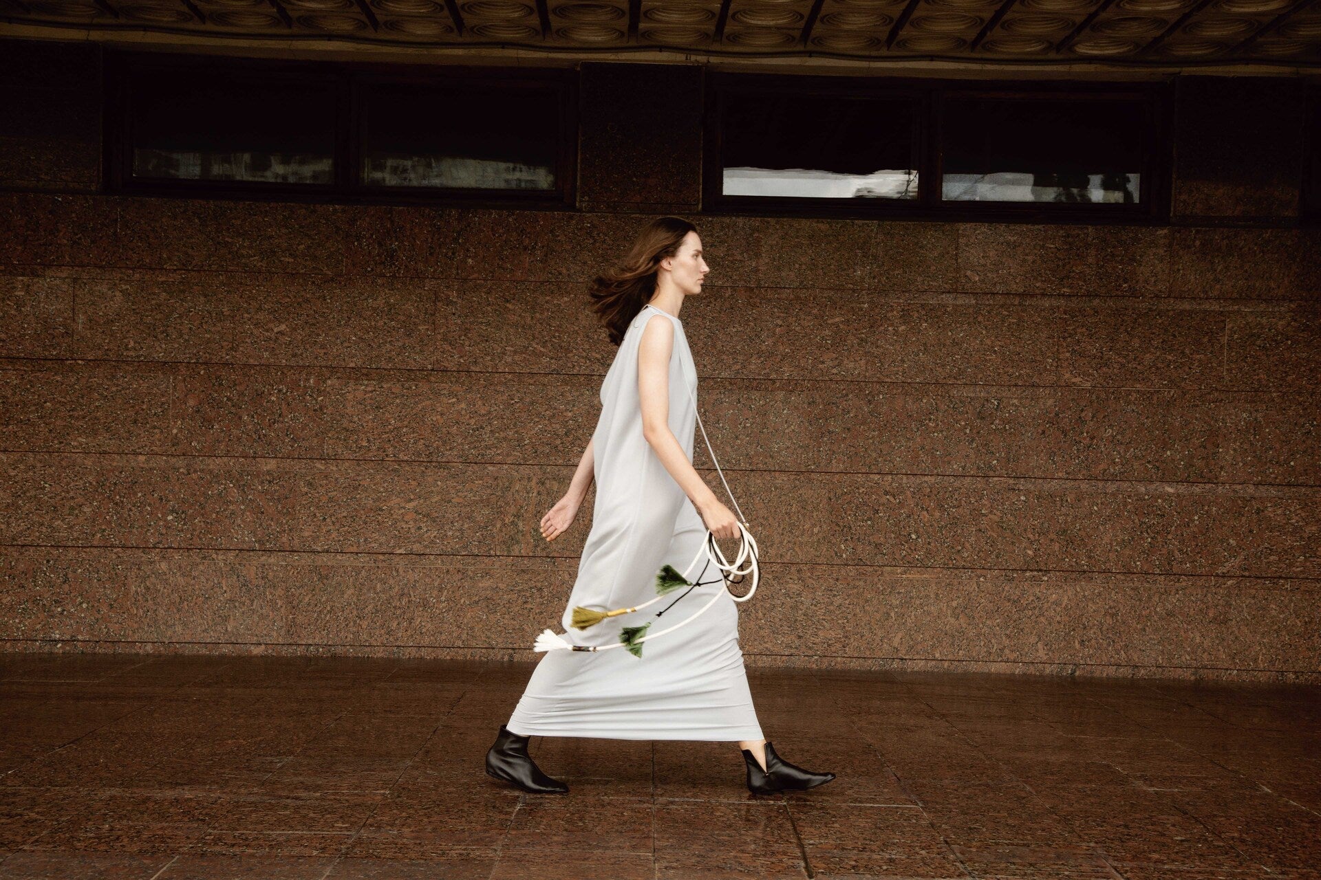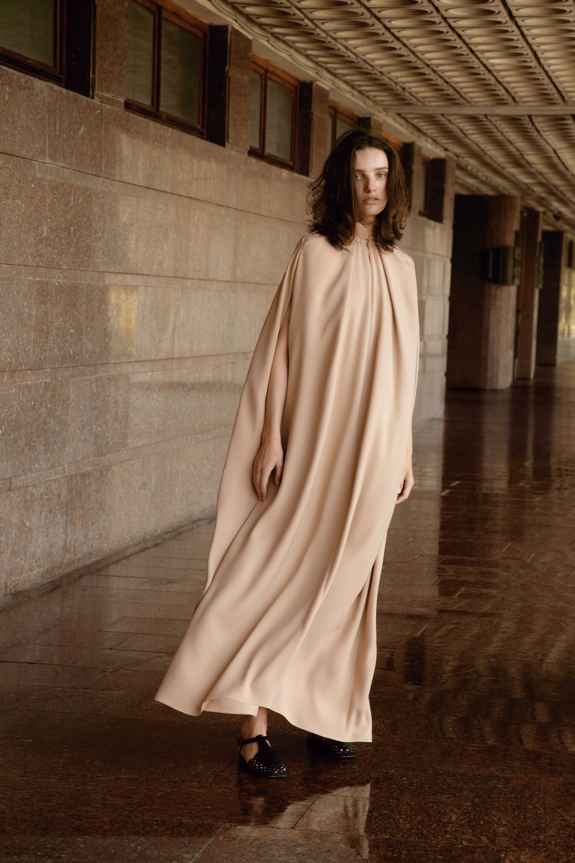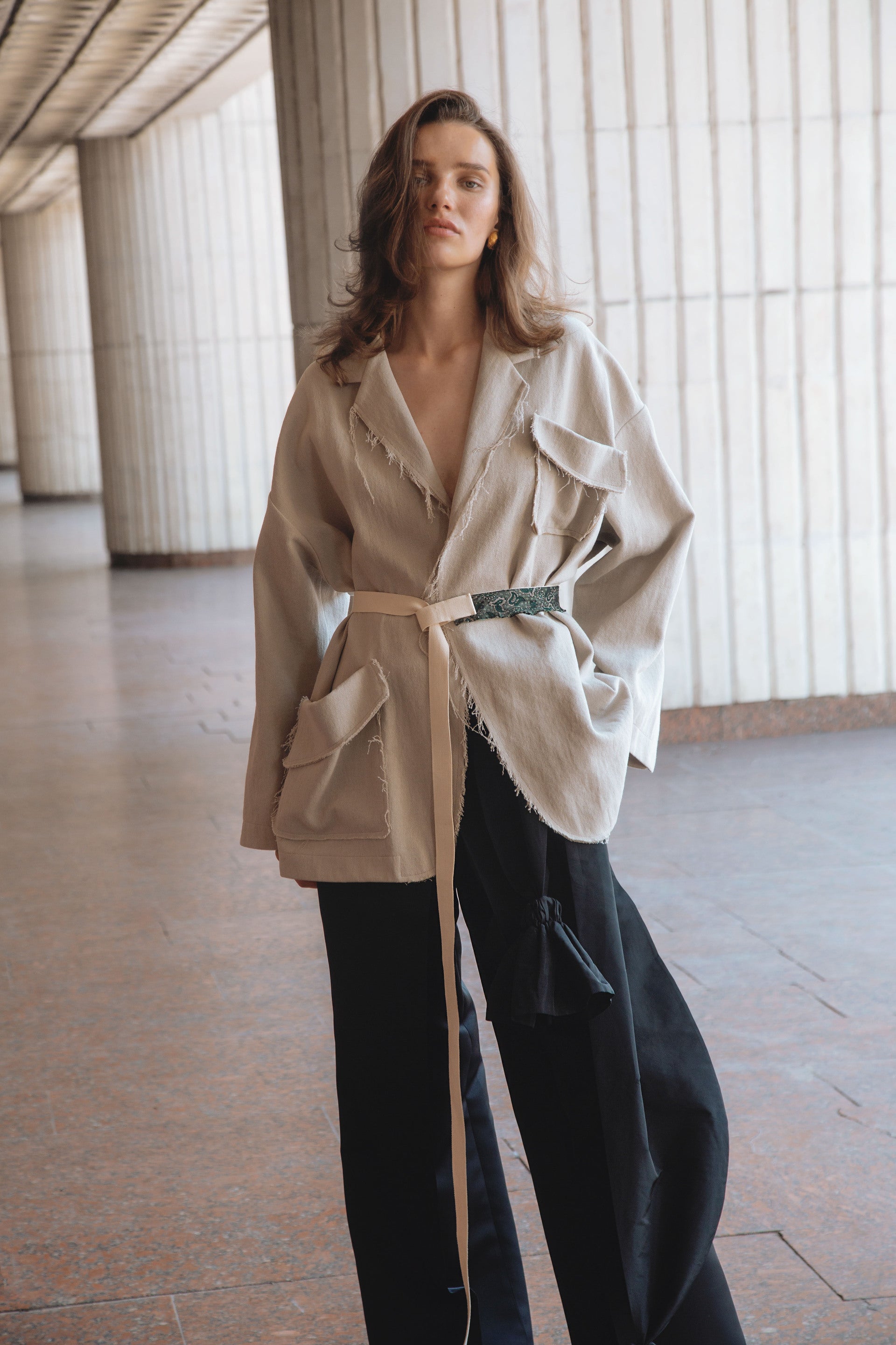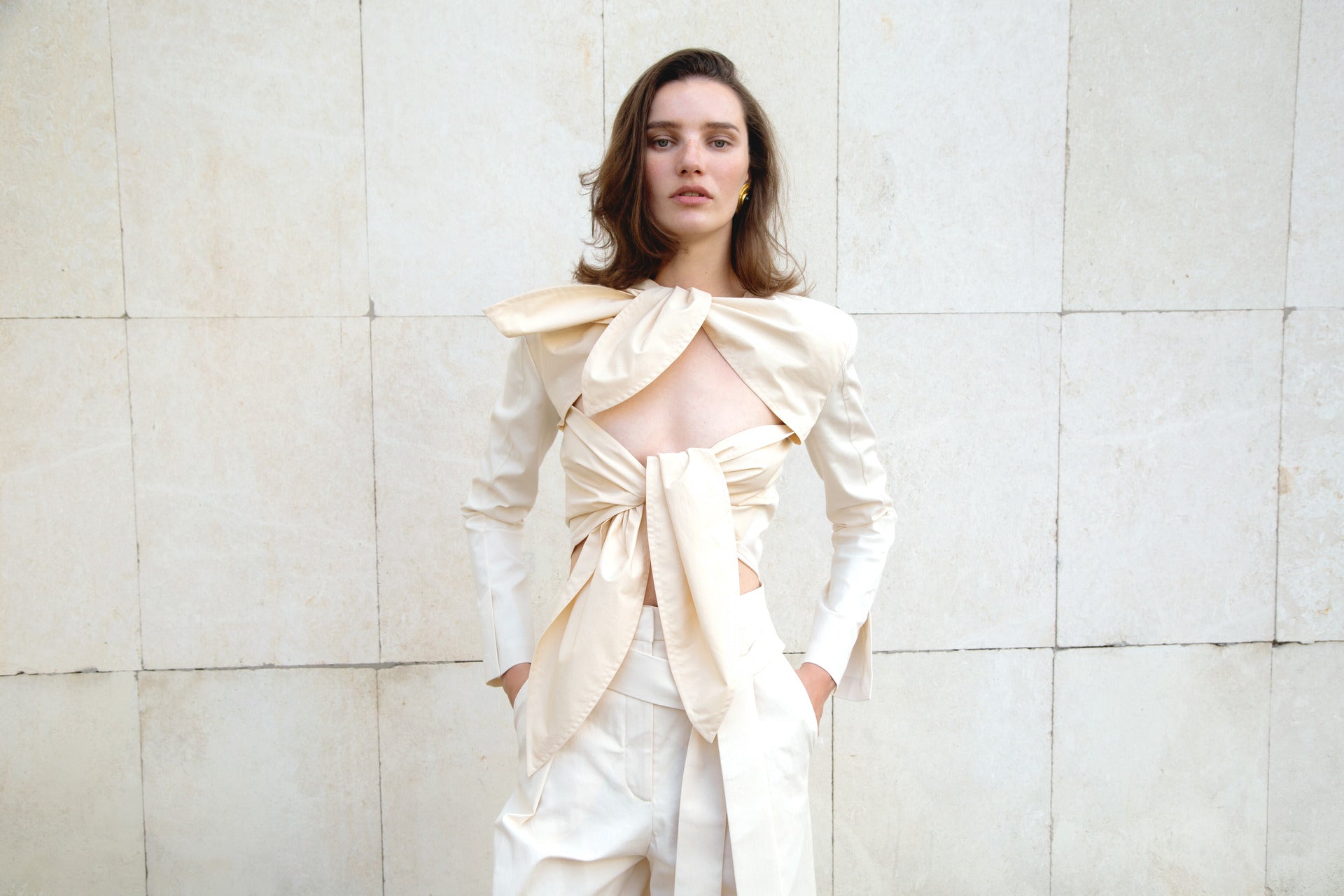 The collection showcases a rich selection of fabrics, featuring linen, cotton, silk, and taffeta. Some items undergo a labor-intensive, unique handwashing technique, resulting in a «crush» effect that exudes relaxed elegance. A carefully curated color palette weaves together shades of white, cream, ecru, and gray, complemented by subtle bursts of green, pink, andred.