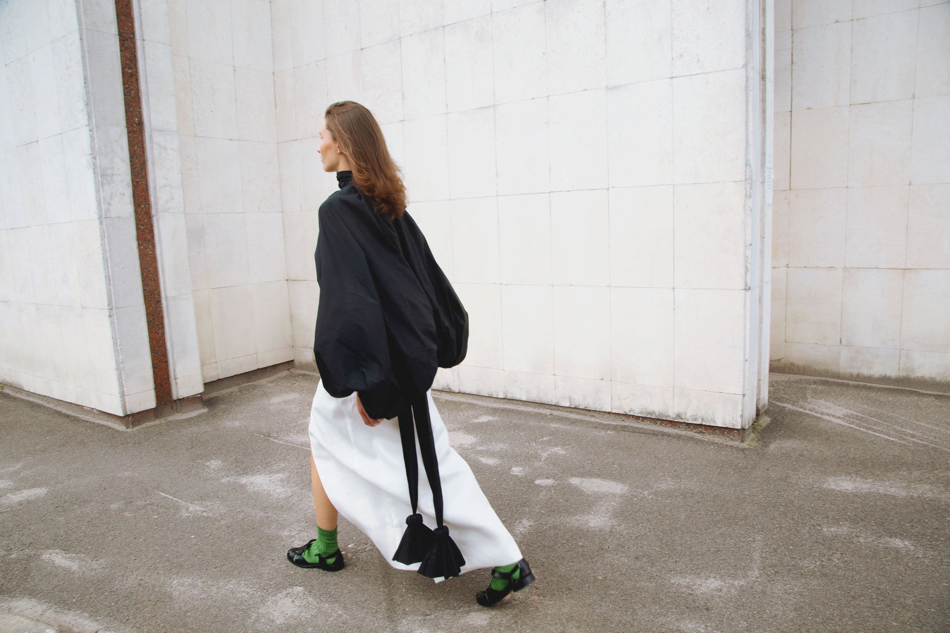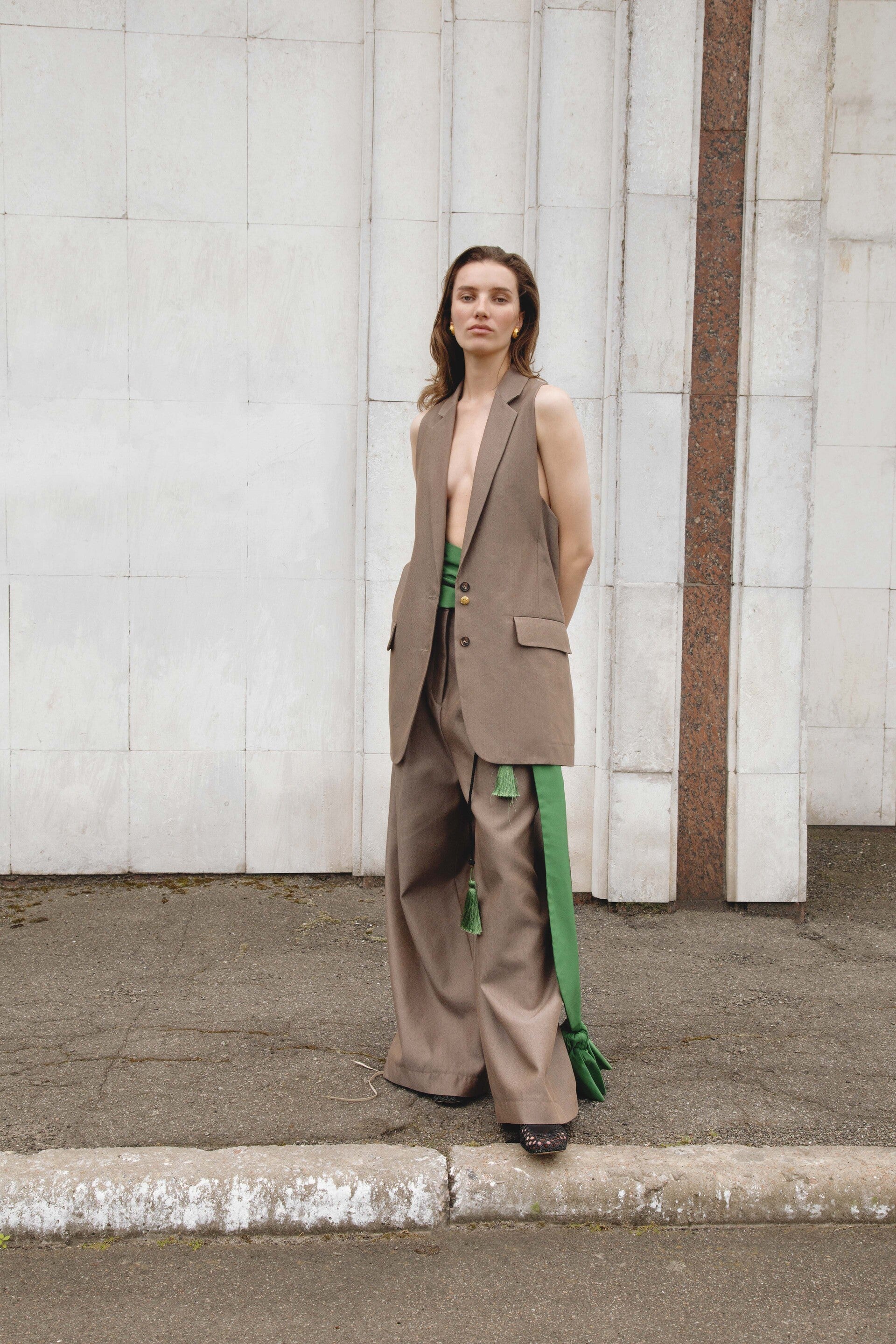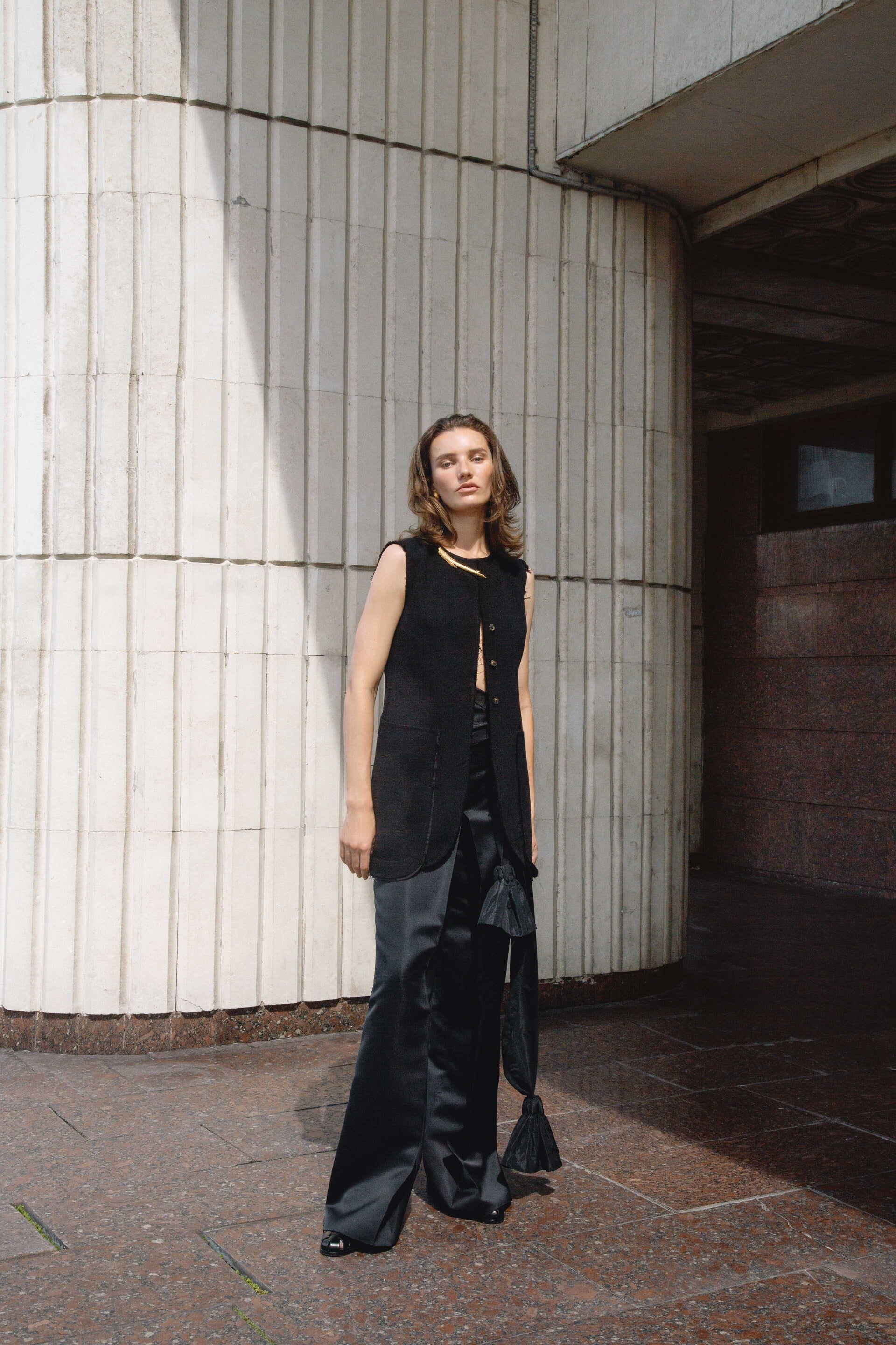 Di Stavnitser SS24 collection embodies the depth and complexity of geometric art, illustrating how spatial relationships and visual transitions can be harnessed to craft pieces brimming with vitality and movement. Remaining devoted to revitalizing vintage elements, Di Stavnitser repurposes vintage silk ties, turning them into accentuated collars, pocket edges, and slits, while vintage buttons and embellishments add charm to jackets and skirts.