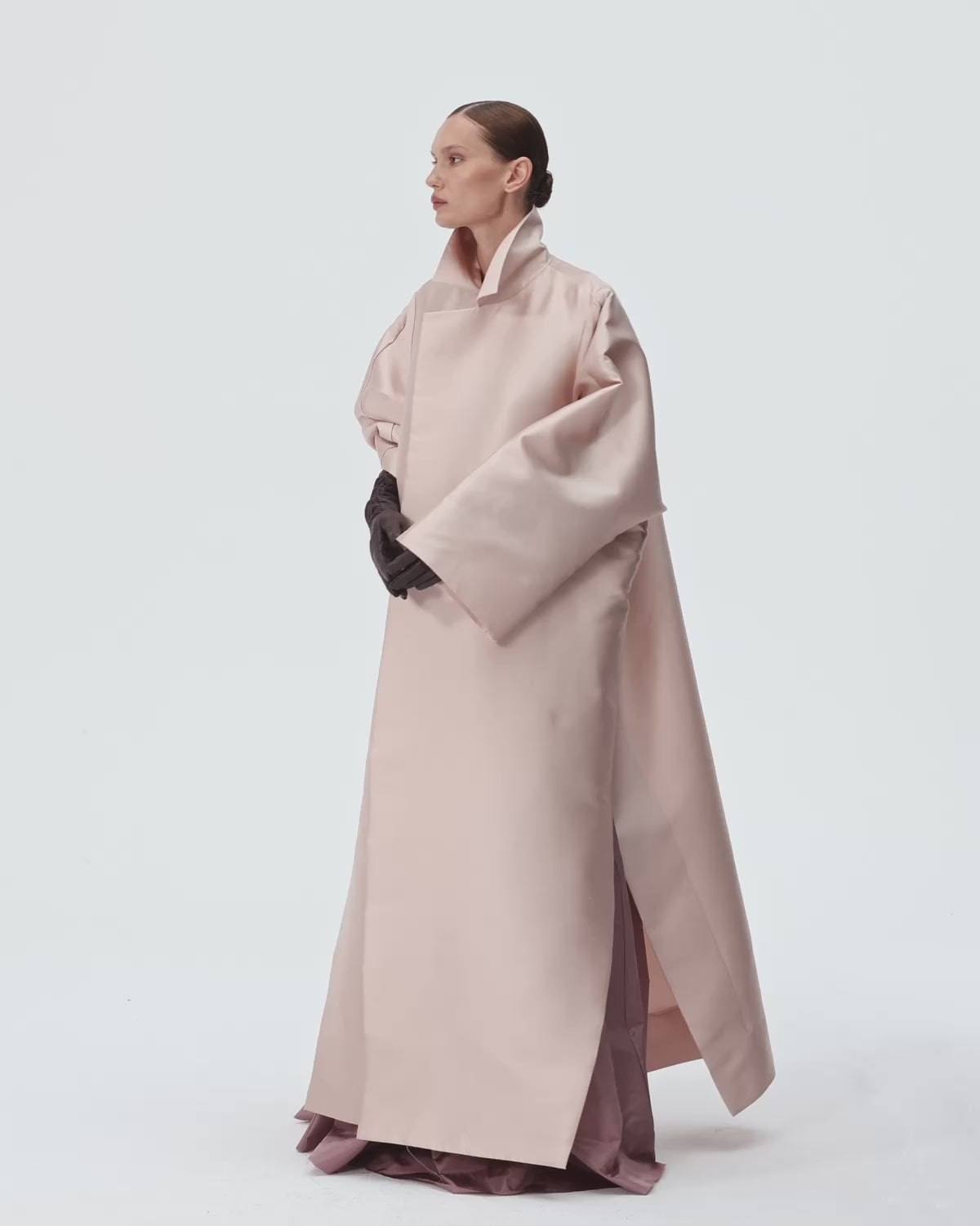 The La Scala Coat delivers dramatic volume with its oversized cut and floor-length design. Crafted from a smooth fabric with a soft sheen, it’s available in both statement Light Pink and Taupe.