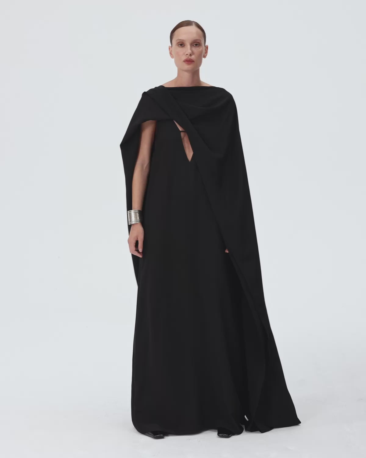 Lea Dress is a flowing maxi with cape-like back layers and side slits. Airy silk creates movement and lightness. Layer with slim belts or wear solo for dramatic evening presence. Available in Red/White, Lucent White, Black.